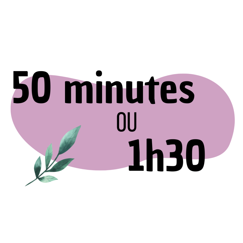 Une séance dure 50 min, mais vous avez la possibilité de prendre du temps en plus, 1h30, si vous souhaitez approfondir certains sujets et profiter au maximum d’un temps passé avec moi.